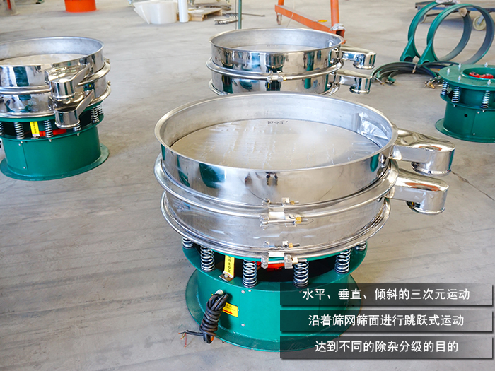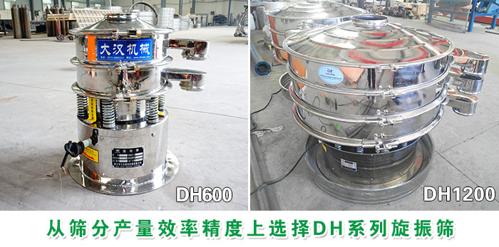 DH系列旋振篩型號(hào)齊全產(chǎn)量大,型號(hào)分為直徑400mm型、600mm型、800mm型、1000mm型、1200mm型、1500mm型、1800mm型、2000mm型等八種標(biāo)準(zhǔn)機(jī)型。篩分分級(jí)橡膠粉處理量可達(dá)400kg-2T/h,可將物料沿著篩網(wǎng)篩面充分篩分,過(guò)網(wǎng)率高篩分精度可達(dá)95%。