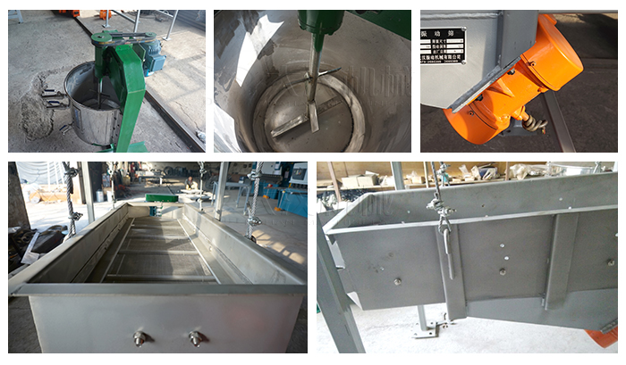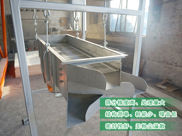 整個(gè)設(shè)備由篩箱、網(wǎng)架、篩網(wǎng)、2臺(tái)臥式振動(dòng)篩電機(jī)、減震彈簧、進(jìn)出料口、上蓋組成,除此之外還有高度可按需求定制的支架通過(guò)四個(gè)吊鉤把整個(gè)設(shè)備吊掛起來(lái)使其處于懸空狀態(tài)。