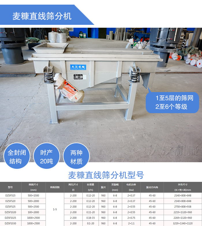 麥糠直線篩分機主要用于大產量篩分工作中,每小時篩分產量可達20噸,不同的型號滿足不同產量的篩分要求,1至5層的篩網安裝能同時將麥糠進行2至6個等級的篩選、分級,雜質、粗料自動化排出,全封閉結構,無粉塵溢散,材質有碳鋼(Q235)不銹鋼(304、316),是一臺大產量篩分設備。